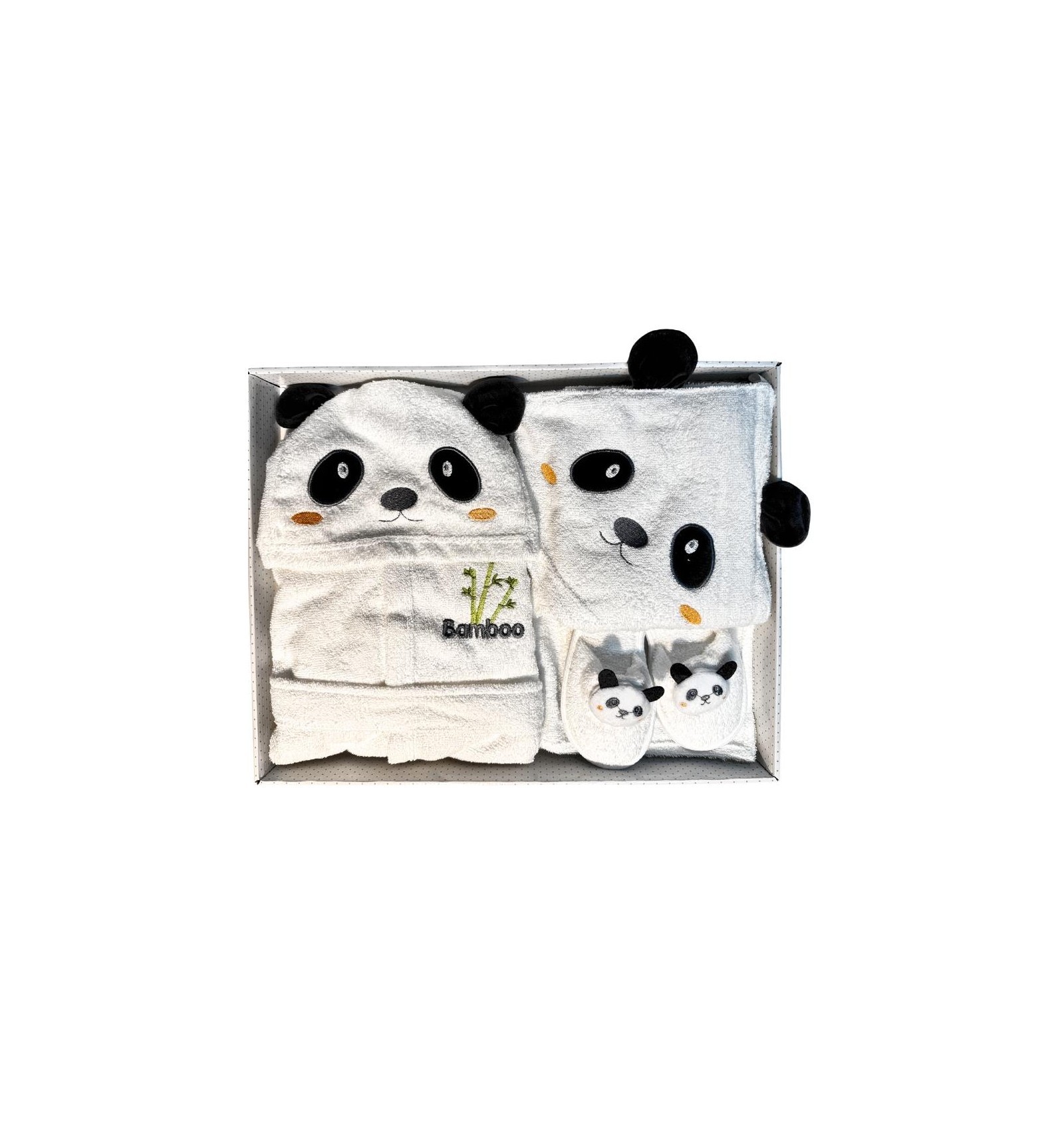 • Un accappatoio con cappuccio decorato con orecchie da panda e ricamo "Bamboo", per avvolgere il tuo bimbo in un caldo abbraccio.