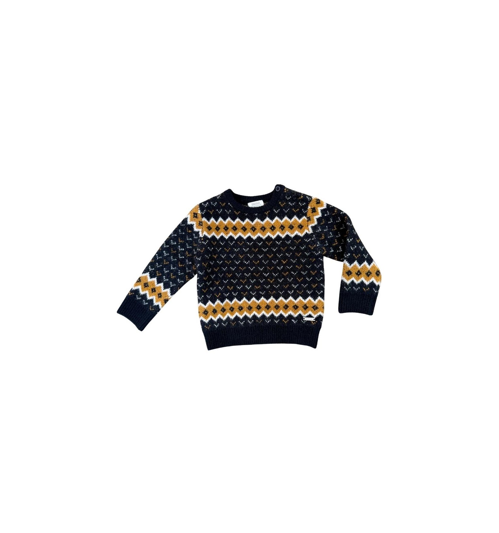 Il design presenta un motivo Fair Isle in tonalità blu navy, senape, bianco e nero, che richiama le atmosfere delle fiabe nordiche. I due bottoni laterali sul collo facilitano la vestizione, rendendolo pratico anche per i più piccoli.
