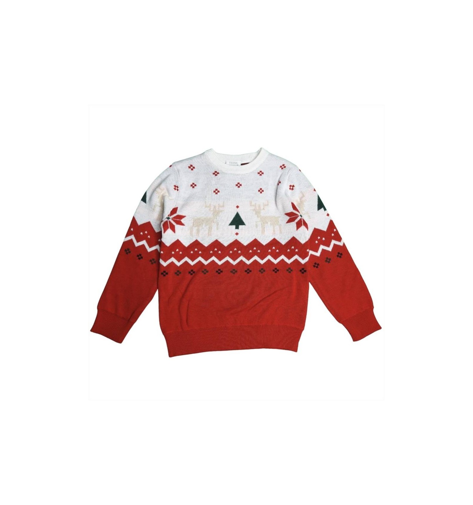 Maglione da bambino a tema natalizio con base rossa e sezione superiore bianca decorata con renne, stelle e alberi di Natale. Motivo a zigzag bianco e dettagli floreali neri sulla parte rossa. Comodo, con maniche lunghe e polsini a coste. Ideale per le festività!
