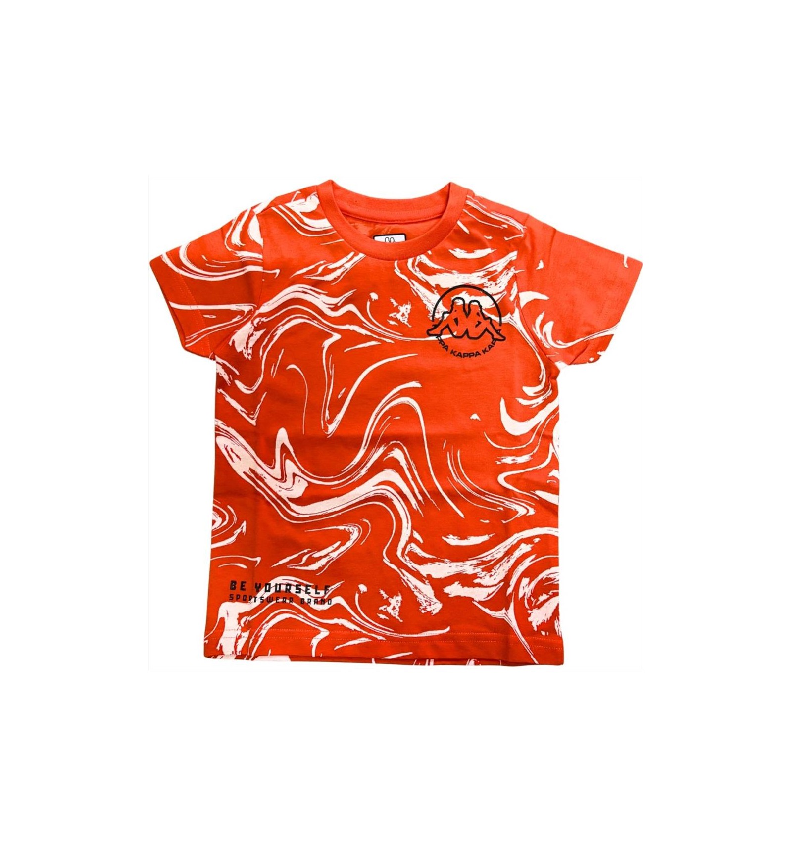 t-shirt arancione firmata Kappa che accende l’estate con energia e stile. Design marmorizzato, logo iconico e messaggio motivazionale per piccoli protagonisti pieni di carattere.
