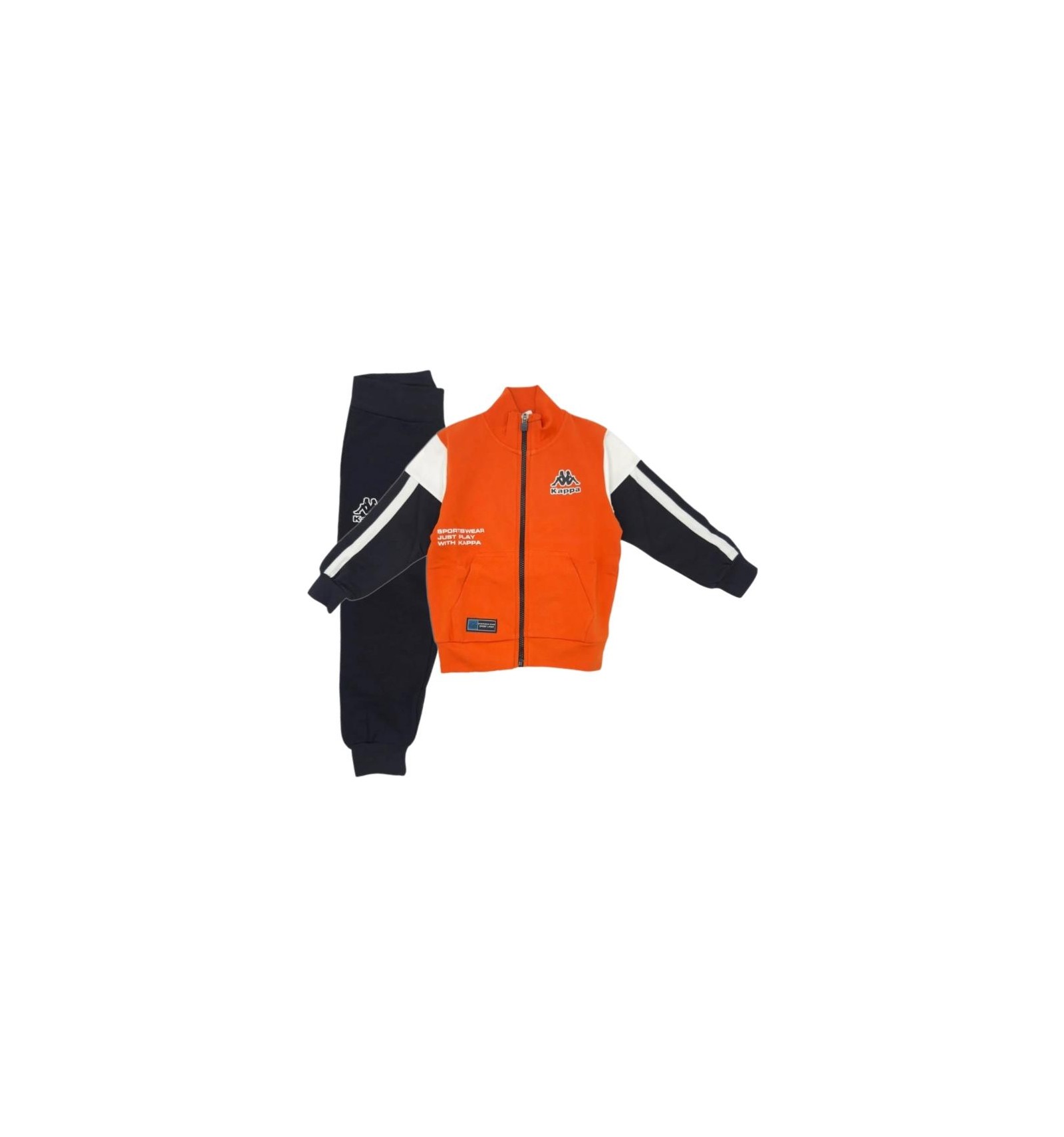 Il giubbino arancione con zip e dettagli bianchi e neri dona un tocco grintoso, mentre il pantalone nero con logo Kappa completa il look con eleganza sportiva. Il messaggio "Just Play with Kappa" sul petto è un invito a vivere ogni giorno con allegria e movimento.